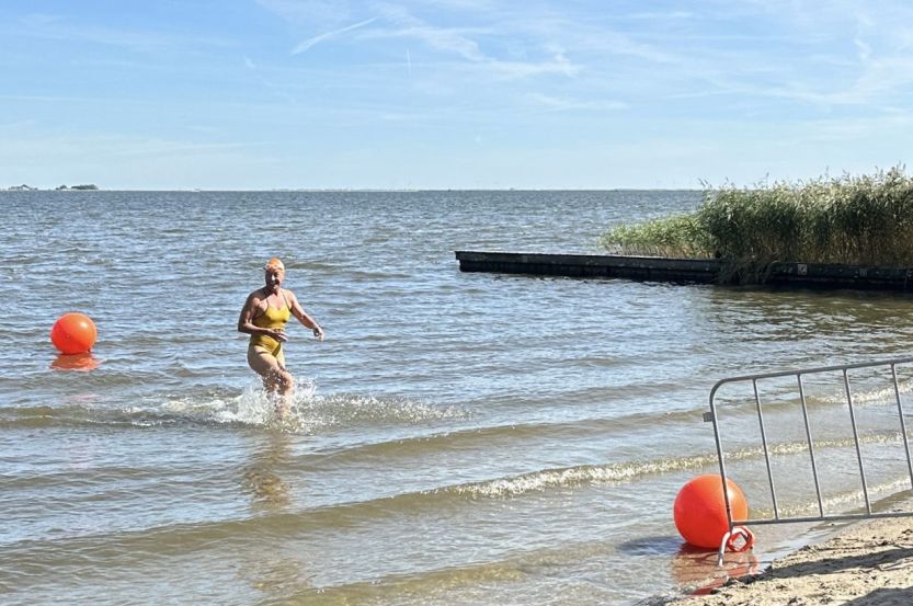 Ik steek mijn hoofd weer onder water en positioneer me zo horizontaal als maar mogelijk in de gegeven condities. Even later vind ik opnieuw het ritme van mijn slag. Een bekende (blijkt achteraf) zwaait en begroet me als hij me voorbij zwemt, grappig. En dan ineens zie ik de rode boeien van het keerpunt de afslag. Dat betekent nog 500 meter te gaan! Met zijwind weliswaar, maar dat is hetzelfde als 10 baantjes in het zwembad dus dat komt goed. Het lukt me om zelfs nog een beetje gas te geven en twee medezwemmers in te halen. Als ik er dan ook nog achter kom dat het water zo ondiep is en ik kan staan, zwem ik helemaal zorgeloos (met of zonder snoekbaarzen!) richting de vlag bij de finishlijn.